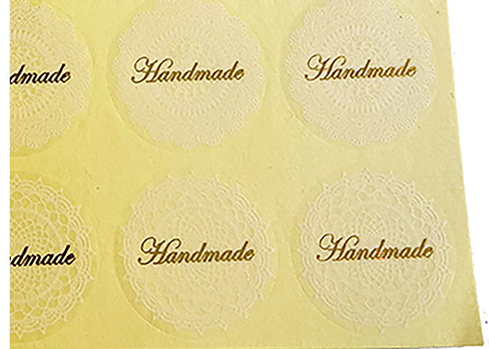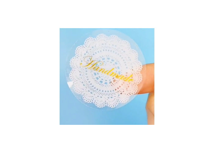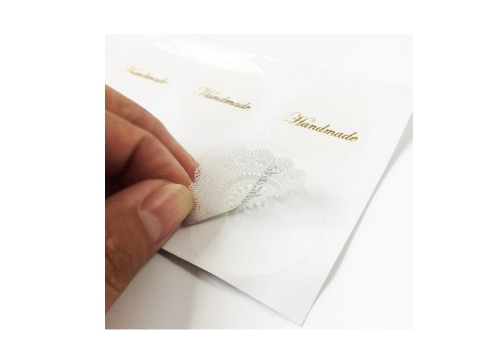 Lovely transparent stickers with Gold "handmade" and white lacing.